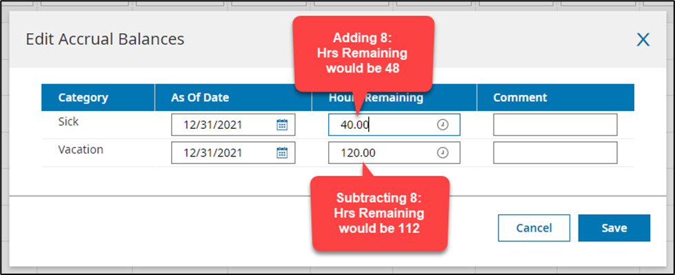 In the hours remaining field, make the required balance adjustment. If adding time, add the additional hours to balance for the new total. If subtracting time, deduct the hours from the balance to get the final balance. In the comment field, write the reason for the adjustment.