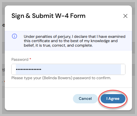A box will pop up asking you to enter your password for submission. Enter your password and then select I Agree to submit the form to your company admin.