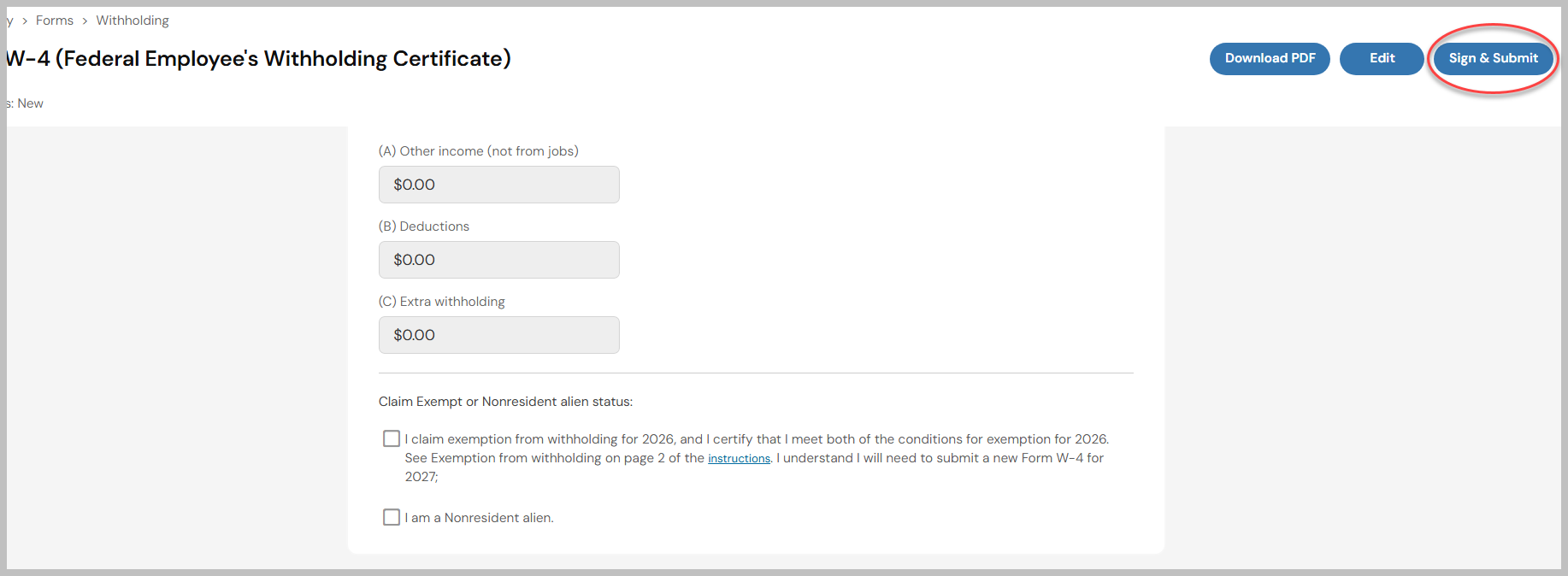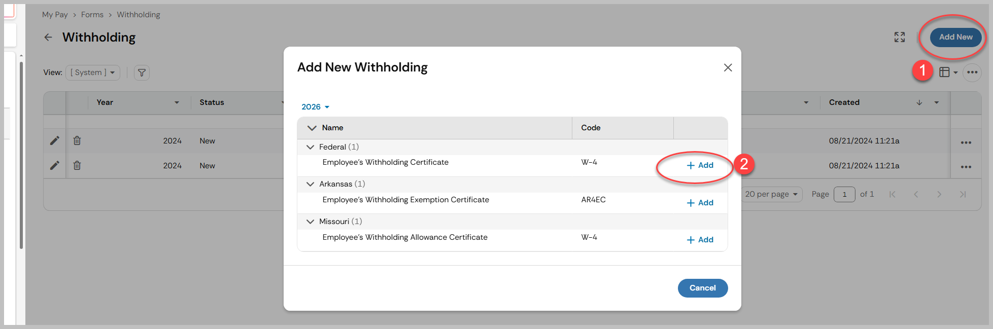 Once on the withholding screen, if you want to update your existing withholding, click on Add New in the right hand corner and then select +Add next to the appropriate form that you want to fill out.