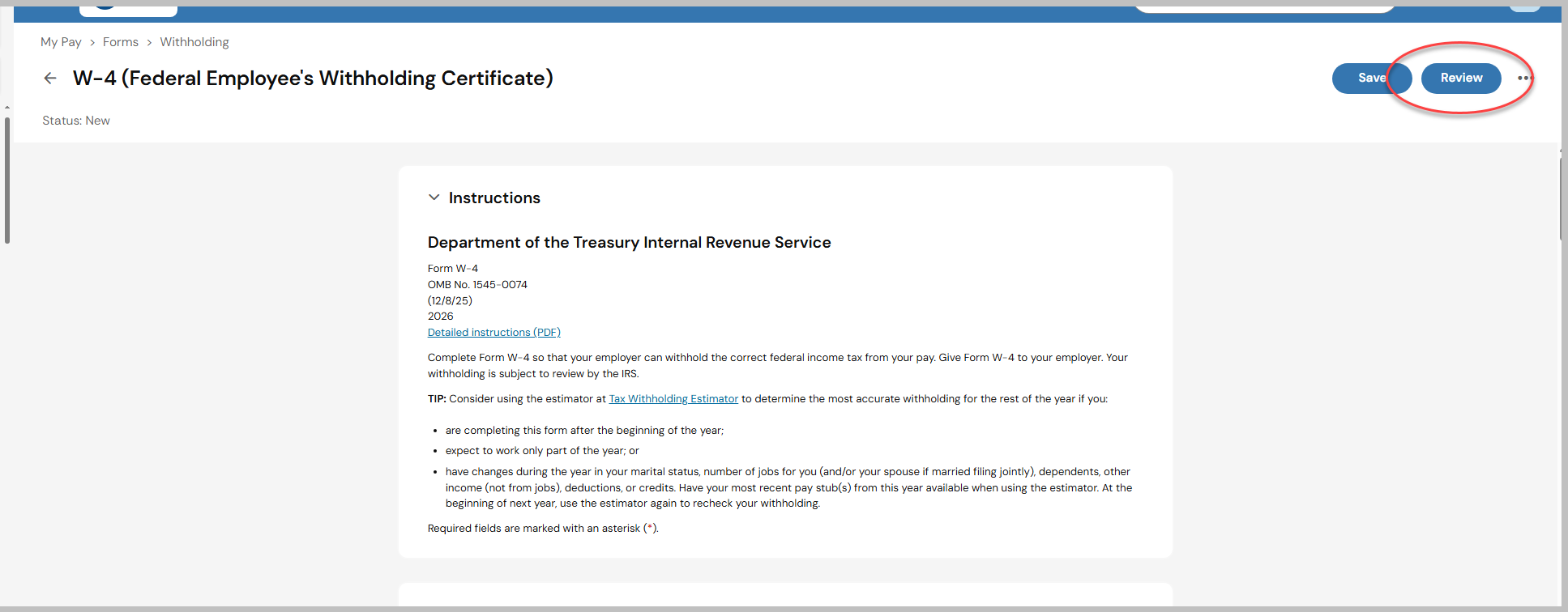 After you complete all applicable fields, click on Review in the top right.