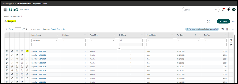From the Payroll screen, you will click on the Quick Links icon closet to the Payroll Name that you are needing reports for.